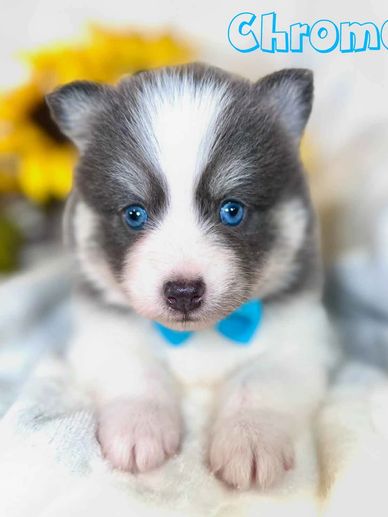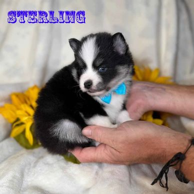 Meet Sterling! This beautiful little black white and silver Pomsky boy has one blue eye and one gold! He is the most precious wooly sweet baby is a dream come true! You won’t find a more exotic and stellar Pomsky anywhere! He is just breathtaking! This Pomsky Puppy is located in Dallas Fort Worth area and can be flown, or driven to you with our express nanny servicing. We also can meet up locally, or at the airport. Do not miss out on this sweet baby. For more information feel free to contact us. See his video below!