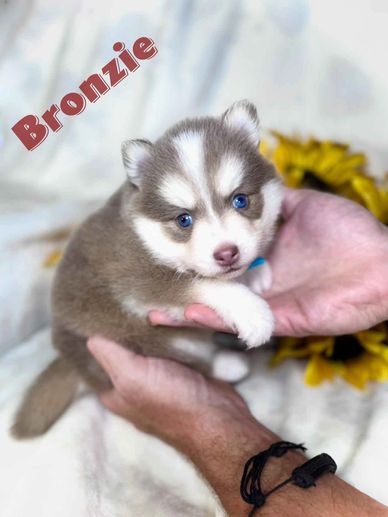 Meet Bronzie, the wooly rare metallic lavender toy/mini male Pomsky with bright blue eyes! Apart from his stellar color and good looks Bronzie loves to play and is just the happiest little guy! Do not miss out on Bronzie! Check out his video below. https://youtube.com/shorts/7zF4-9_eJbQ?si=ccBct9xHE_LAYGmt